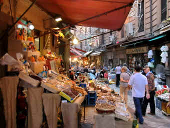 | BALLARO’ Si estende da piazza Casa Professa ai bastioni di corso Tukory verso Porta Sant'Agata. Ballarò è il più antico mercato di Palermo, frequentato giornalmente da centinaia di persone di tutte le razze, animato dalle cosiddette abbanniate cioè i chiassosi richiami dei venditori che, con il loro caratteristico e colorito accento locale, cercano di attirare l'interesse dei passanti. Essendo aperto anche per tutto il pomeriggio, è visitato da coloro che stanno rincasando, cosicché vi si trovano venditori di cibi cotti, tipici della cucina palermitana, pronti da portare a casa, come cipolle bollite o al forno, panelle, cazzilli (crocchette di patate), verdure lesse, polipo e quarume (interiora di vitello). |