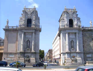 mare", per la quale proprio lanno precedente avevano avuto inizio i lavori. La prima pietra per il monumentale ingresso, che venne cosi denominato dal nome di donna Felice Orsini moglie del vicere, fu posta il 6 luglio del 1582. Una netta dicotomia stilistica caratterizza i due prospetti della Porta: quello rivolto verso la citta mostra una equilibrata impostazione manieristica, per la quale emergono con forza, dalla piattezza delle superfici, i forti timpani delle finestre e le aggettanti cornici e marcapiani; ad un linguaggio di esuberanza gia barocca e invece improntato il prospetto esterno, la cui forza plastica si anima con il gioco chiaroscurale delle imponenti colonne architravate al primo ordine, che serrano due nicchie con canefore, e dei due attici simmetrici, dal tipico bizzarro repertorio barocco. Le due statue agli angoli raffigurano S. Cristina (a sinistra) e S. Ninfa (a destra). I decori marmorei furono eseguiti da Nicolo Travaglia |