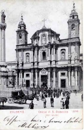 realizzati nel 1640 sotto la direzione del domenicano Andrea Cirrincione. Essa si eleva su due piani; le colonnine aggettanti suddividono il prospetto in tre partiti di cui quello centrale e concluso da un frontone curvilineo. I due campanili laterali, di squisito disegno, assicurano slancio verticale. La decorazione a stucco fu eseguita nel 1755-56 da G.M. Serpotta; si notino i Pontefici disposti a coppie su plinti tra i putti che reggono i simboli del potere papale; nelle nicchie del secondo ordine sono impostati I Santi domenicani. Sopra la porta dingresso e lo stemma dellOrdine: un cane con la fiaccola in bocca, seduto sul libro delle Costitutiones. Linterno e caratterizzato da una maestosa solennita. Dal 1853, la chiesa e Pantheon dei siciliani illustri, e accoglie le spoglie di artisti, letterati e uomini politici che si distinsero nella storia di Sicilia. |